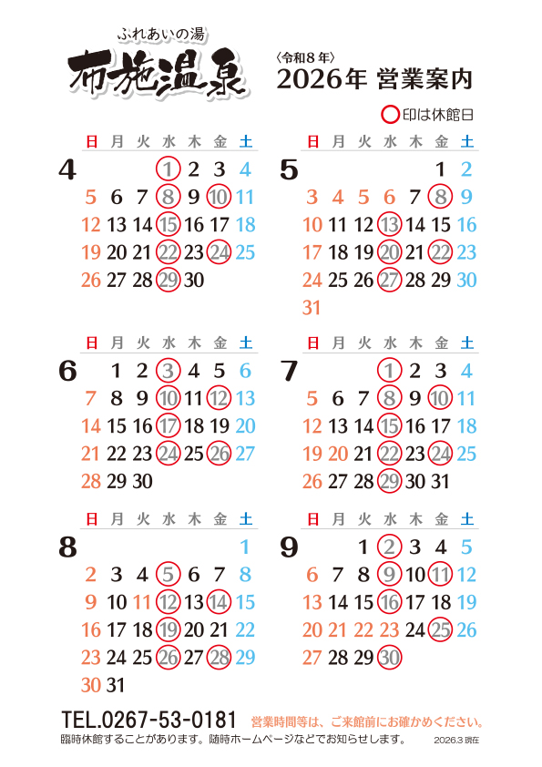 令和8年4月現在の営業状況は、下記のとおりです。なお、諸般の事情により、急遽変更となる場合がございます。その節は何卒ご容赦くださいますようお願いいたします。