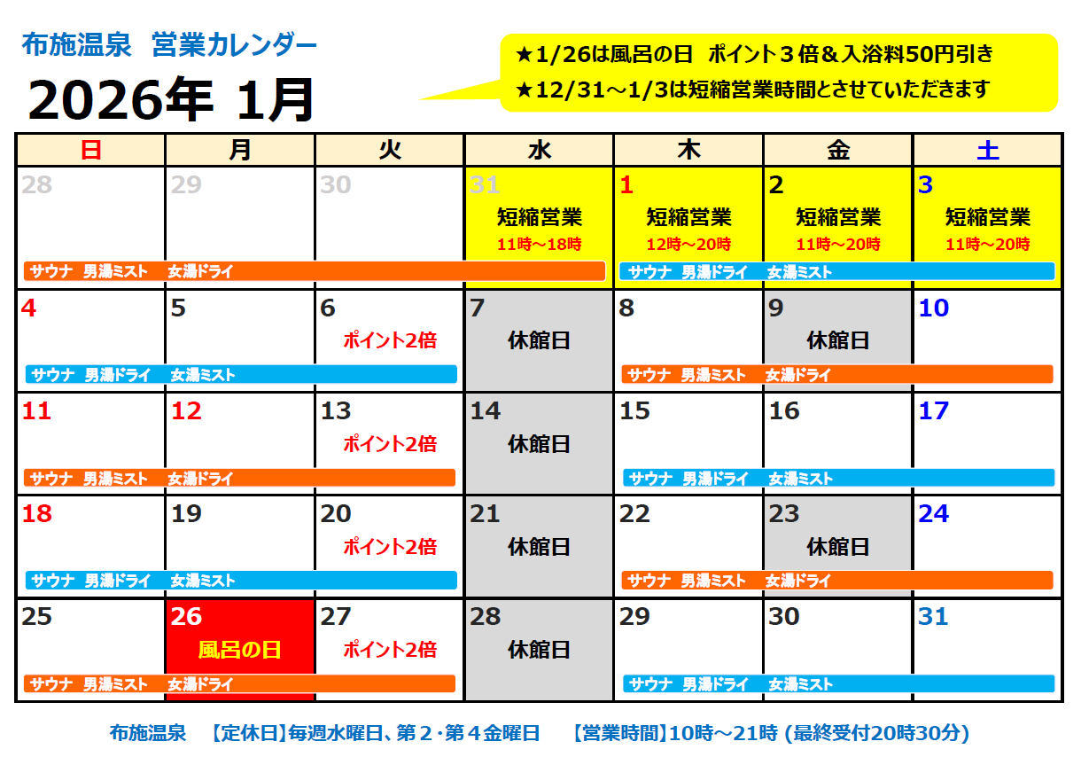 布施温泉の2026年1月の営業日は下記のとおりです。