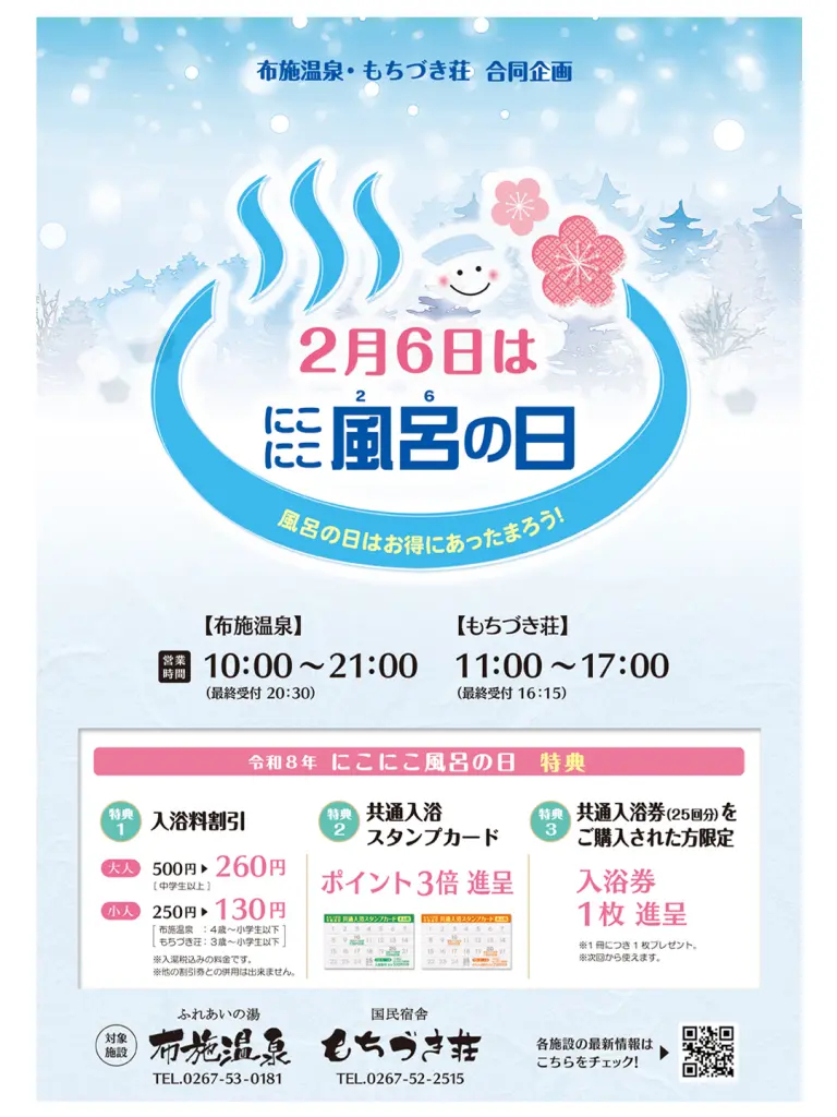 2月6日はもちづき荘との合同開催「にこにこ風呂の日」の日です。 お得に日帰り入浴がご利用いただけます!