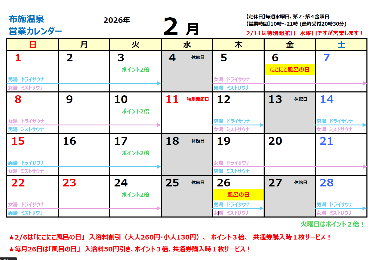 布施温泉の2026年2月の営業日は下記のとおりです。