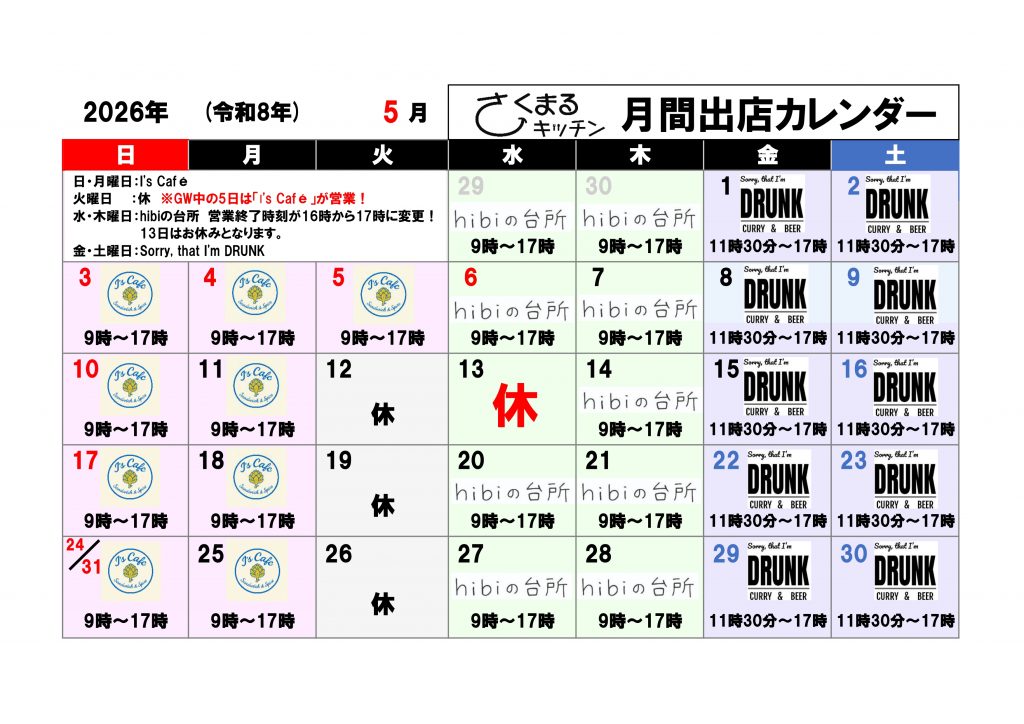 ・1階さくまるキッチン(シェアキッチン)は、毎週火曜日は定休日ですが、5月5日(火)は、I’s Cafeさんが出店予定です。