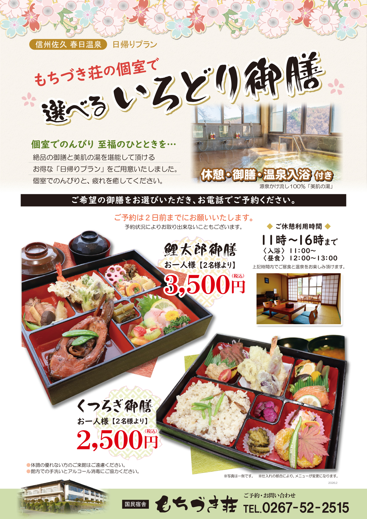 日帰りプランは、お電話(0267-52-2515)でご予約ください。お部屋の空き状況によっては、お取りできない場合もございますのでご容赦ください。