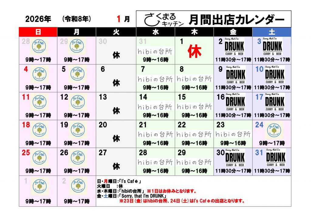 ○プラザ佐久1階「さくまるキッチン」・・・1/1臨時休業、1/23~24出店者変更がございます。下記カレンダーをご覧ください。
