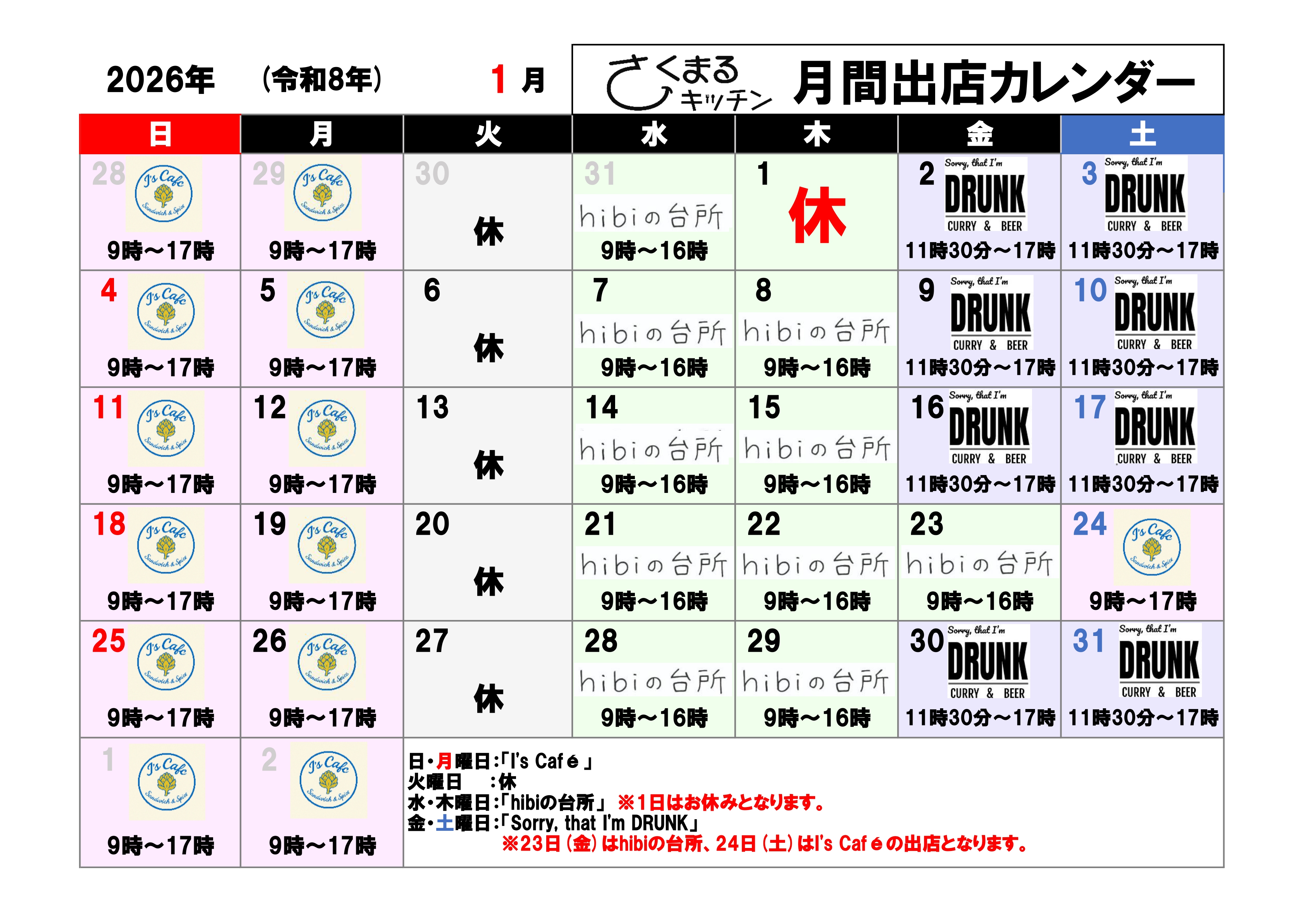 1/23(金)~24(土)は 「Sorry, that I’m DRUNK」 お休みで、23日は「hibiの台所」 24日は「I’s Cafe」に出店者変更になります。