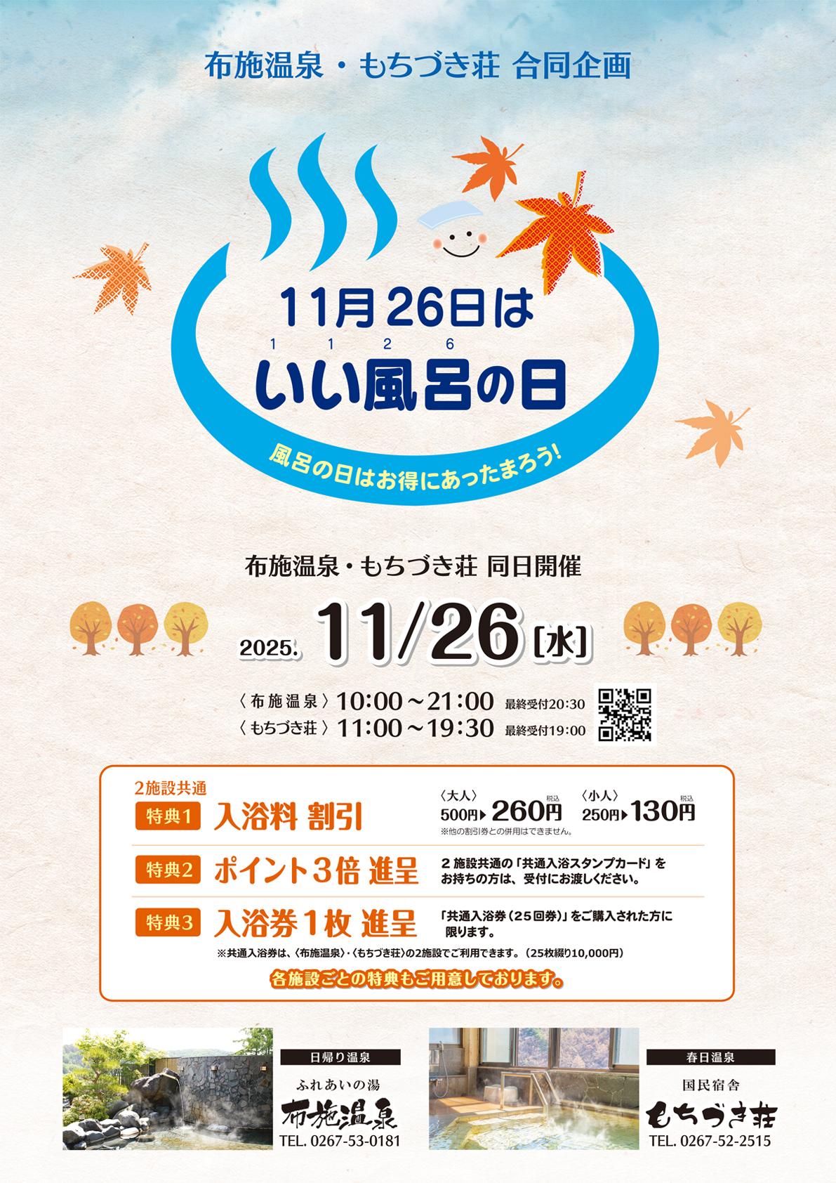 もちづき荘&布施温泉 いい風呂の日(11/26) 今年も11/26 「いい風呂の日」イベントを開催します。お出かけください! 入浴料の割引、スタンプカード3倍押印など実施します。 ★布施温泉は、水曜日ですが特別開館します。 ★もちづき荘は、水曜日は時間延長の日なので、19:30(最終受付19:00)まで営業します。