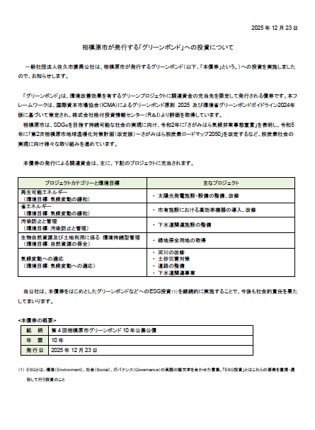 一般社団法人佐久市振興公社は、神奈川県相模原市が発行するグリーンボンド「第4回相模原市グリーンボンド10年公募公債」への投資を実施しました。