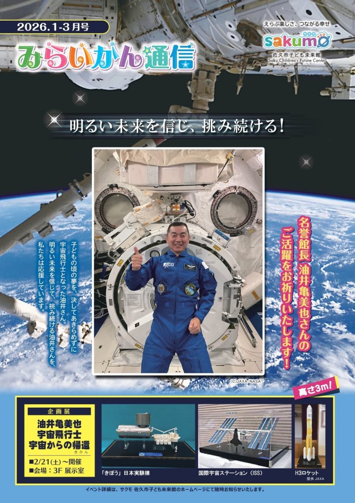 みらいかん通信2026年1~3月号できました みらいかん通信 2026年1~3月号 ができました。 佐久市子ども未来館の冬のイベントが満載です! 国際宇宙ステーションに長期滞在している油井宇宙飛行士(佐久市子ども未来館名誉館長)に関連し、プラネタリウム新番組「国際宇宙ステーションからの眺め」、企画展も2月21日から開催します。 画像をクリックすると、みらいかん通信のページへ移動します(+を押して開いてご覧下さい!)👇