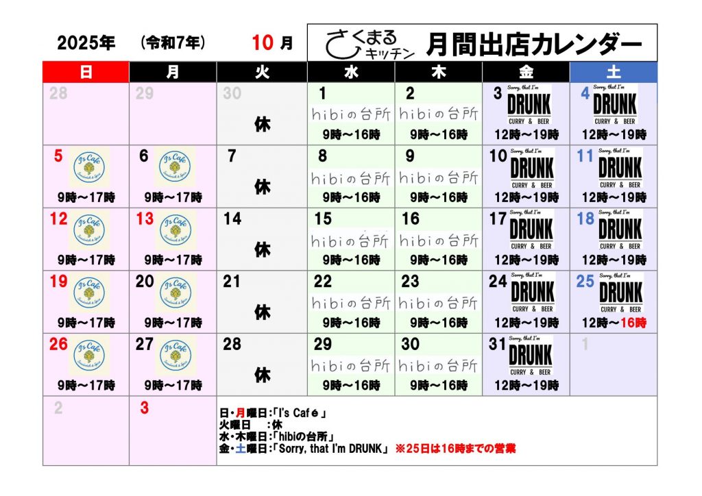 令和7年10月現在の営業状況は、下記のとおりです。なお、諸般の事情により、急遽変更となる場合がございます。その節は何卒ご容赦くださいますようお願いいたします。