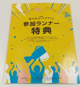 既に申込は締切となっていますが、参加者の皆様には、アスリートビブスなどが入った封筒が届いていることかと思います。その中に、「参加ランナー特典チラシ」が入っています。佐久市振興公社でも、特典をご用意しましたので、ぜひ、お立ち寄りください。