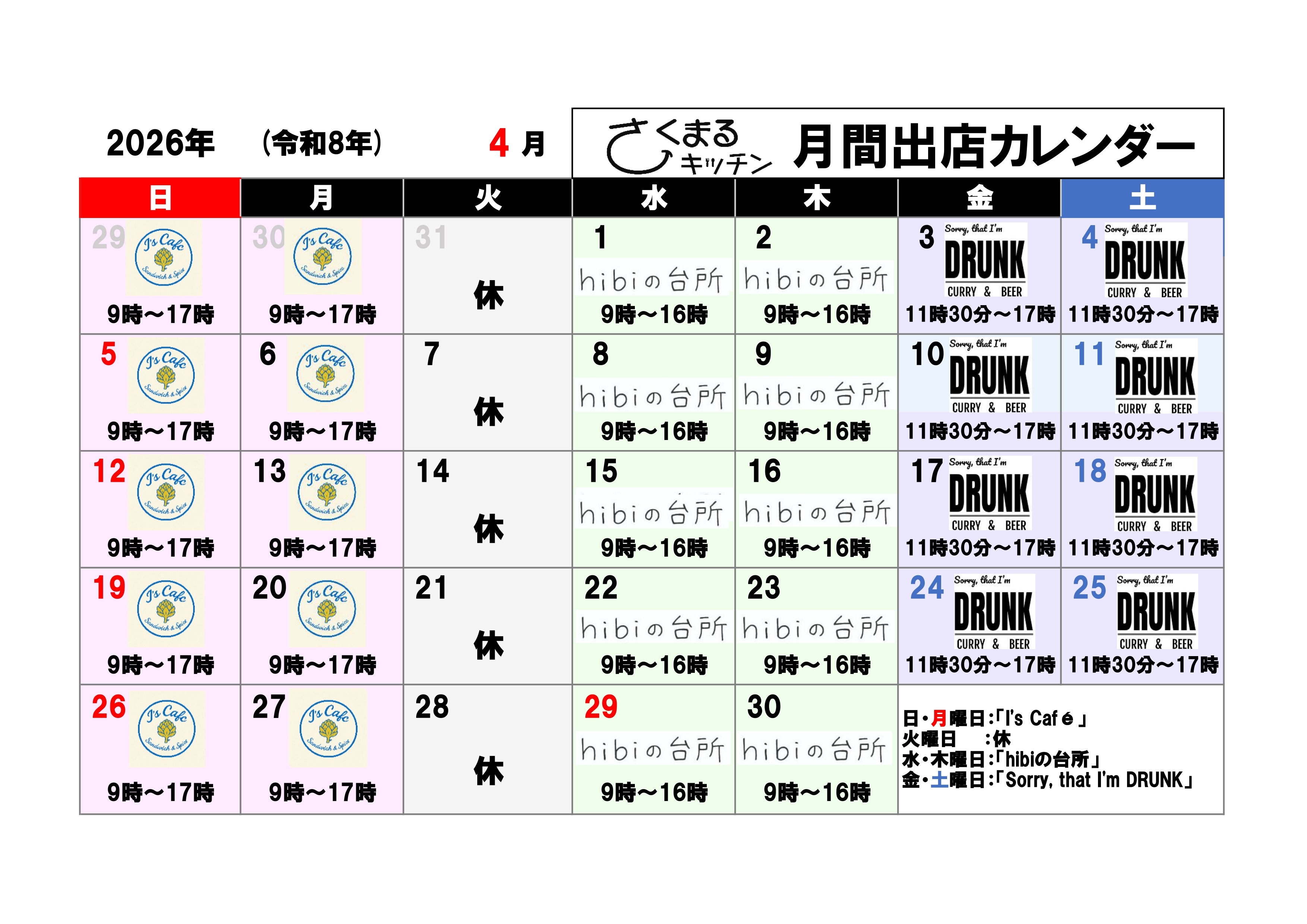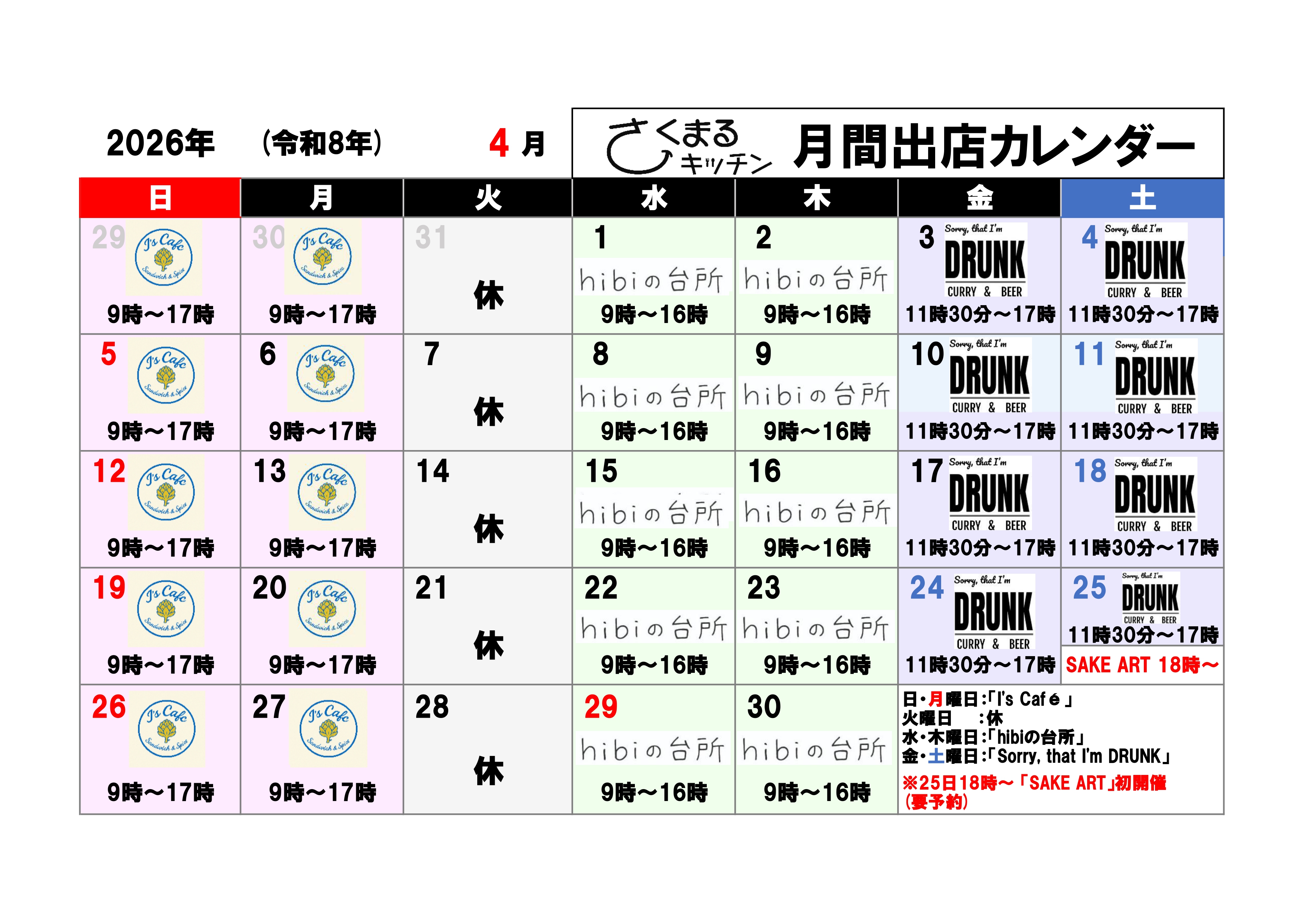 ★お知らせ 2026年4月のカレンダーできました!