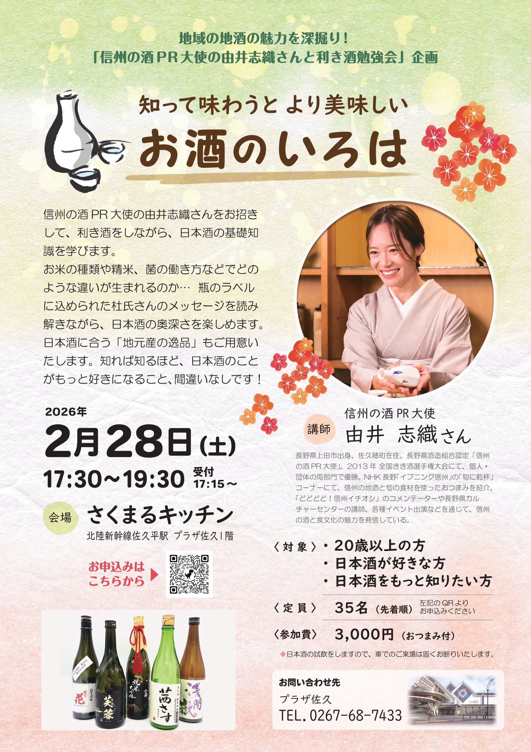信州の酒PR大使の由井志織さんをお招きして、利き酒をしながら日本酒の基礎知識を学びます。