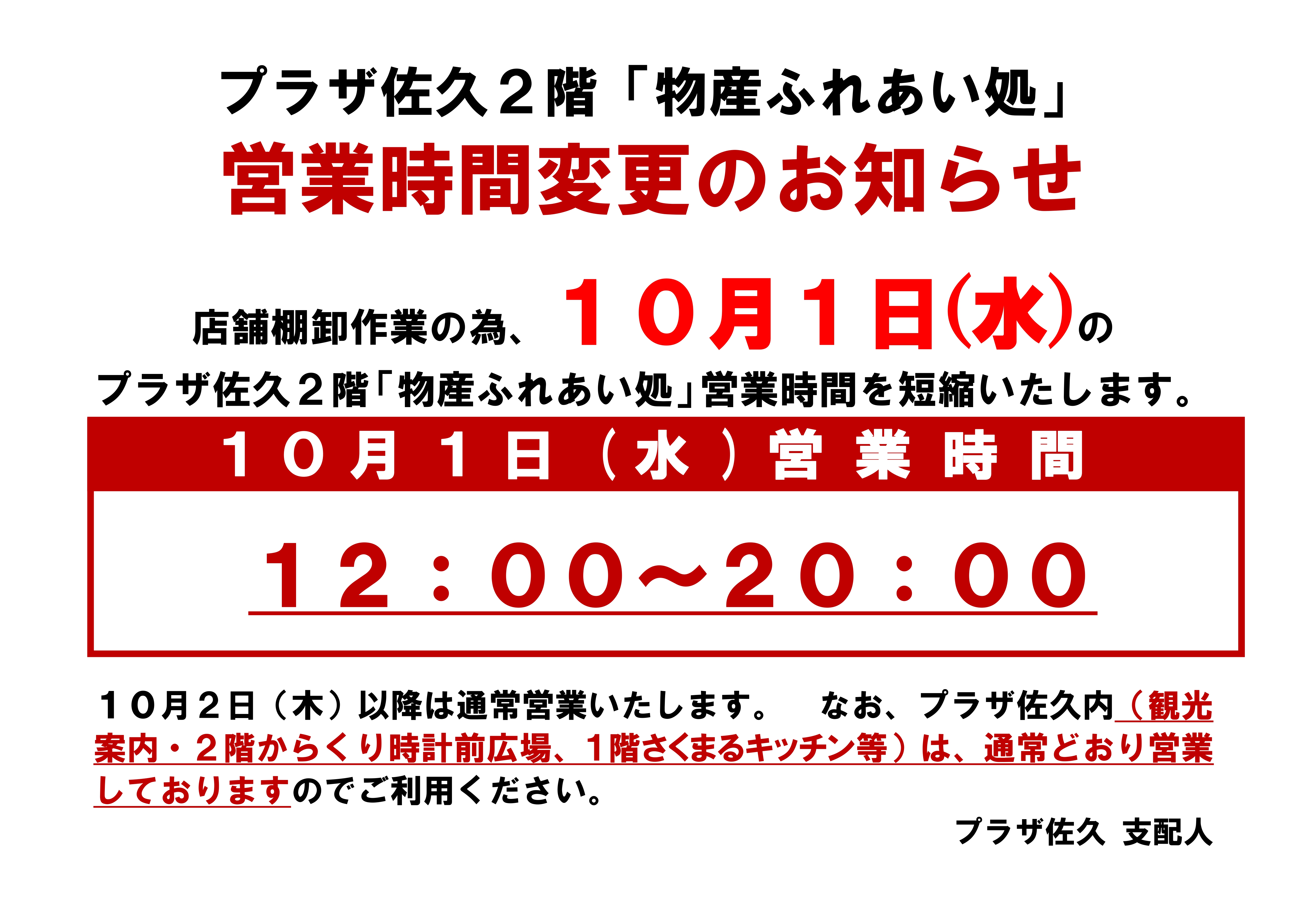 平素は格別のご愛顧を賜り、有難うございます。 10月1日(水)は店内棚卸しのため、営業時間を下記の通り変更させていただきます。