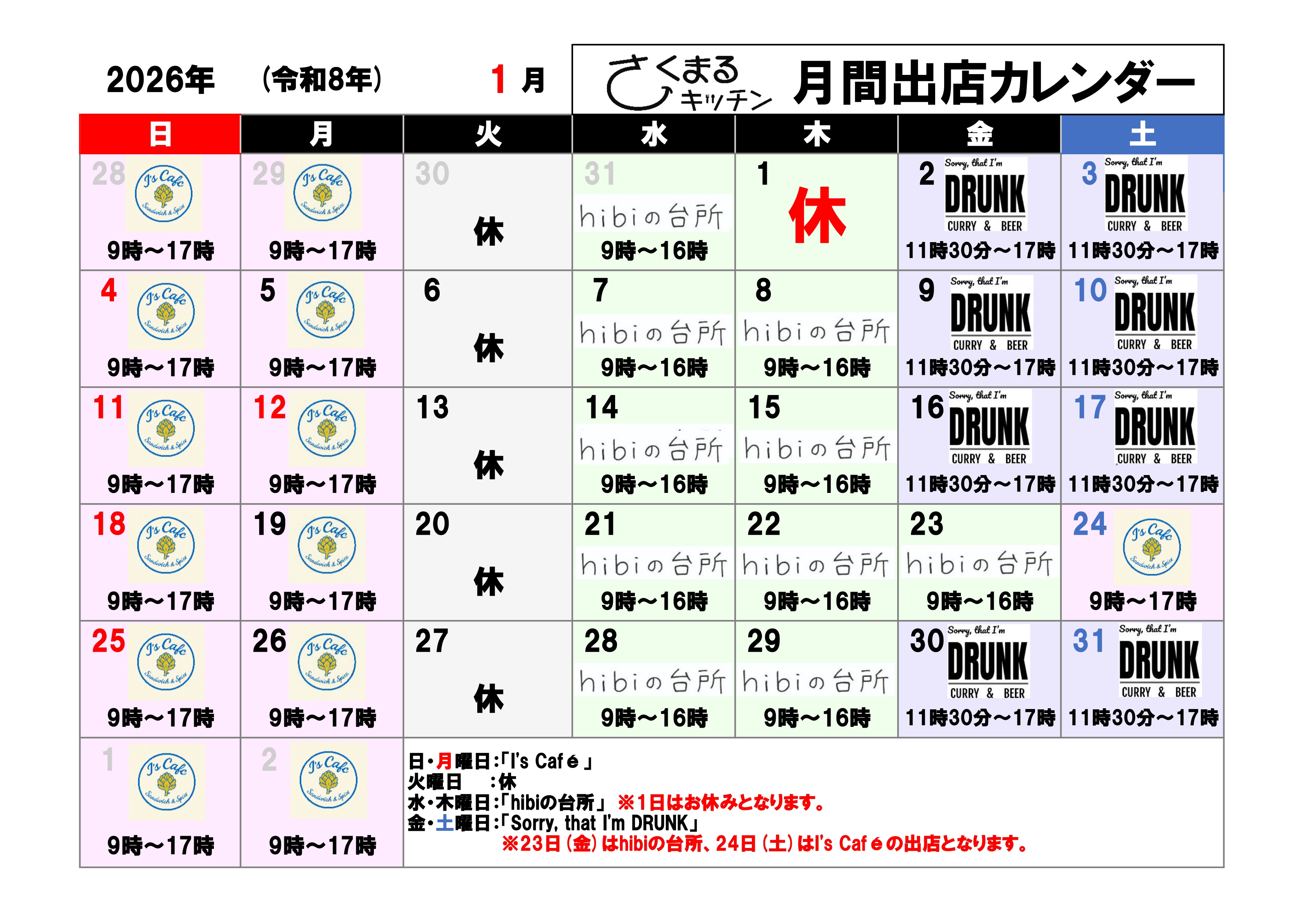 さくまるキッチン1月営業カレンダー
