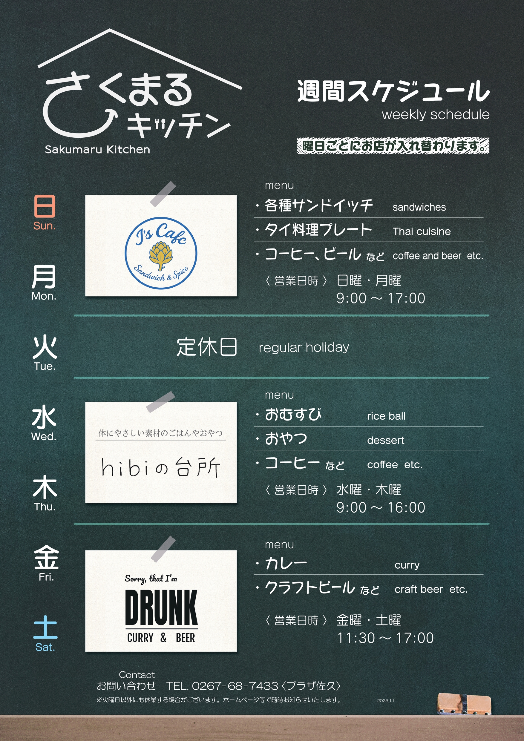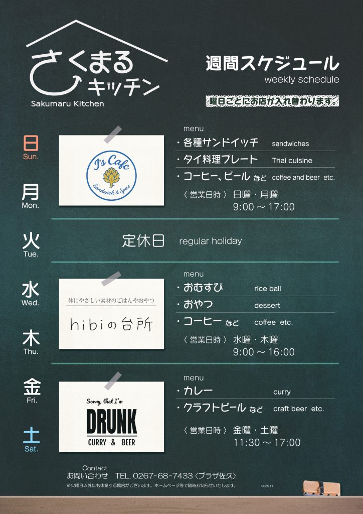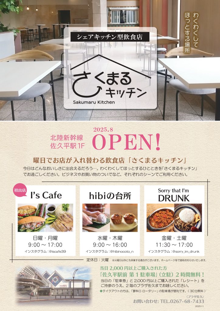 「さくまるキッチン」は、北陸新幹線佐久平駅 プラザ佐久1階にあるシェアキッチンです。2025年7月に改装オープンし、シェアキッチンになりました。曜日ごとにお店が入れ替わりますので、いろいろなお料理を楽しむことができます。